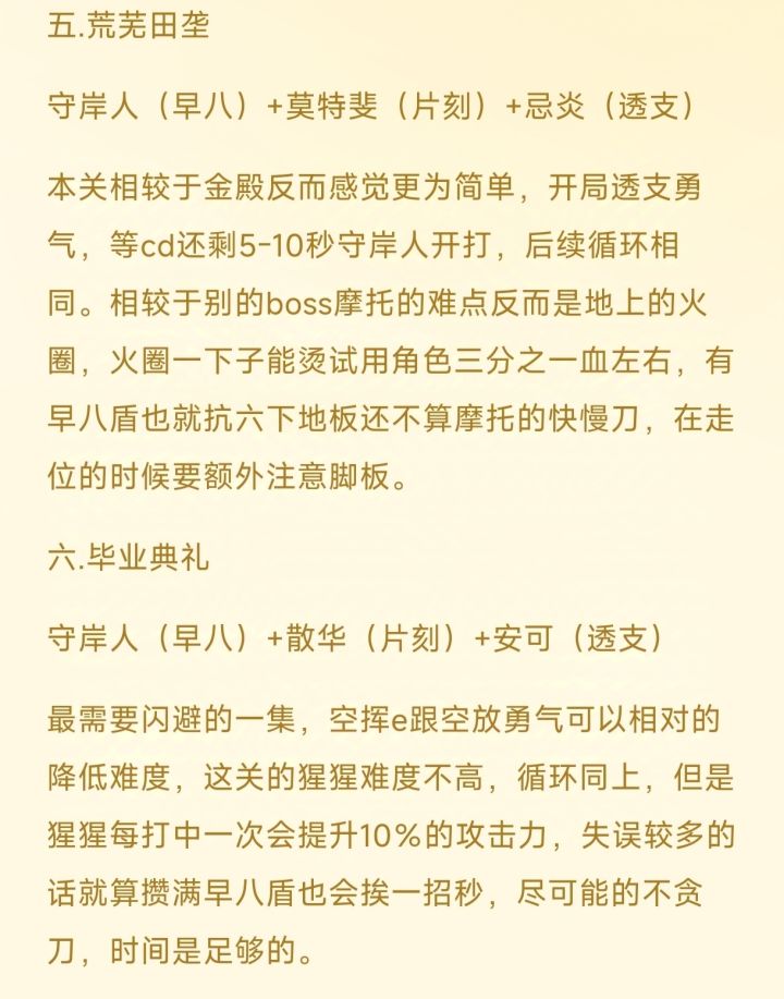 本关的摩托是有两条命的,第一条命没有韧性条直接守岸人q+莫特斐qe+忌炎qe,在忌炎无敌时间+守岸人附加的生命期间可以打掉摩托大半的血,后续按常规莫特斐与忌炎轮切打掉摩托第一条命,莫特斐的第二个q记得留给摩托第二条命的破韧,第二条命开始直接切回守岸人打满大招与协奏后续接莫特斐与忌炎常规轮切即可。