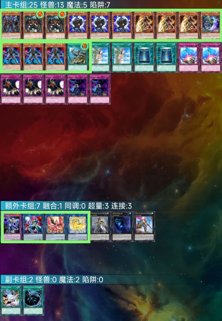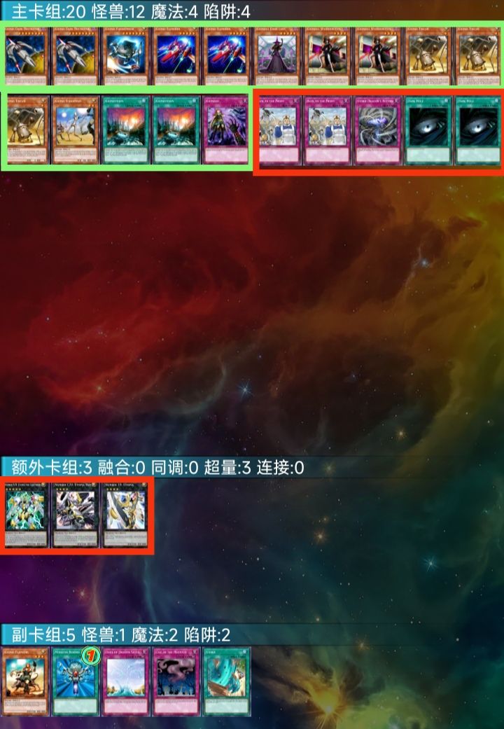 细说卡组。绿框是该卡盒卡或者容易获得的卡。红框是需另抽的重要卡。