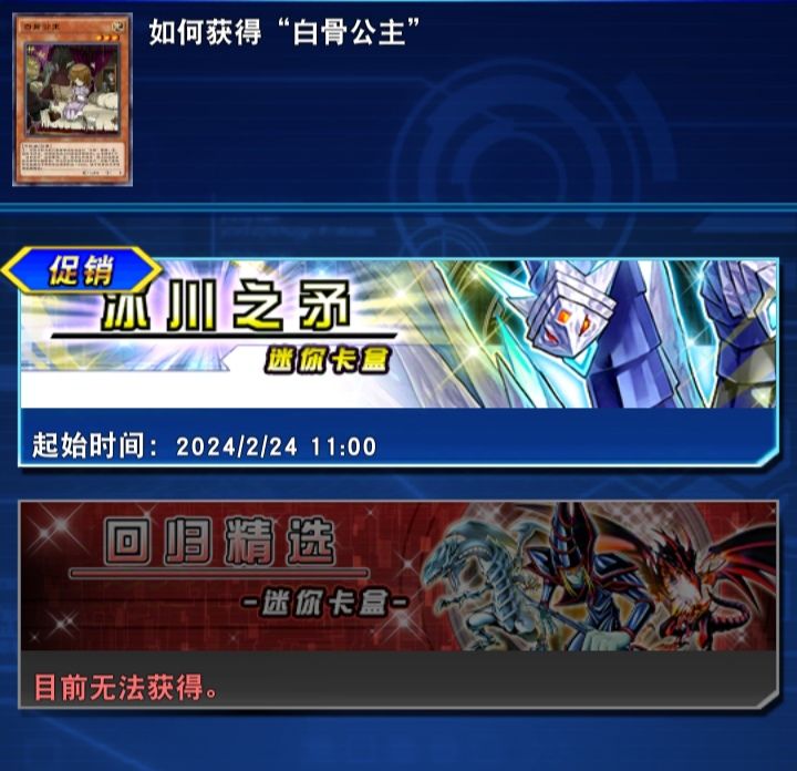 没必要为了白骨公主去抽冰川之矛小包。白骨在回归小包。离线1个月以上再次登陆有回归小包,完成任务可以获得80抽。有黑魔导、机皇卡组,还有白骨。