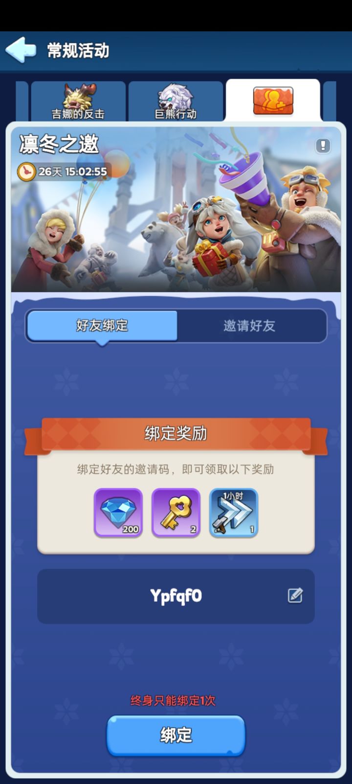 游戏内右上角点击常规活动>顶部滑块找到凛冬之邀>输入邀请码:Ypfqf0