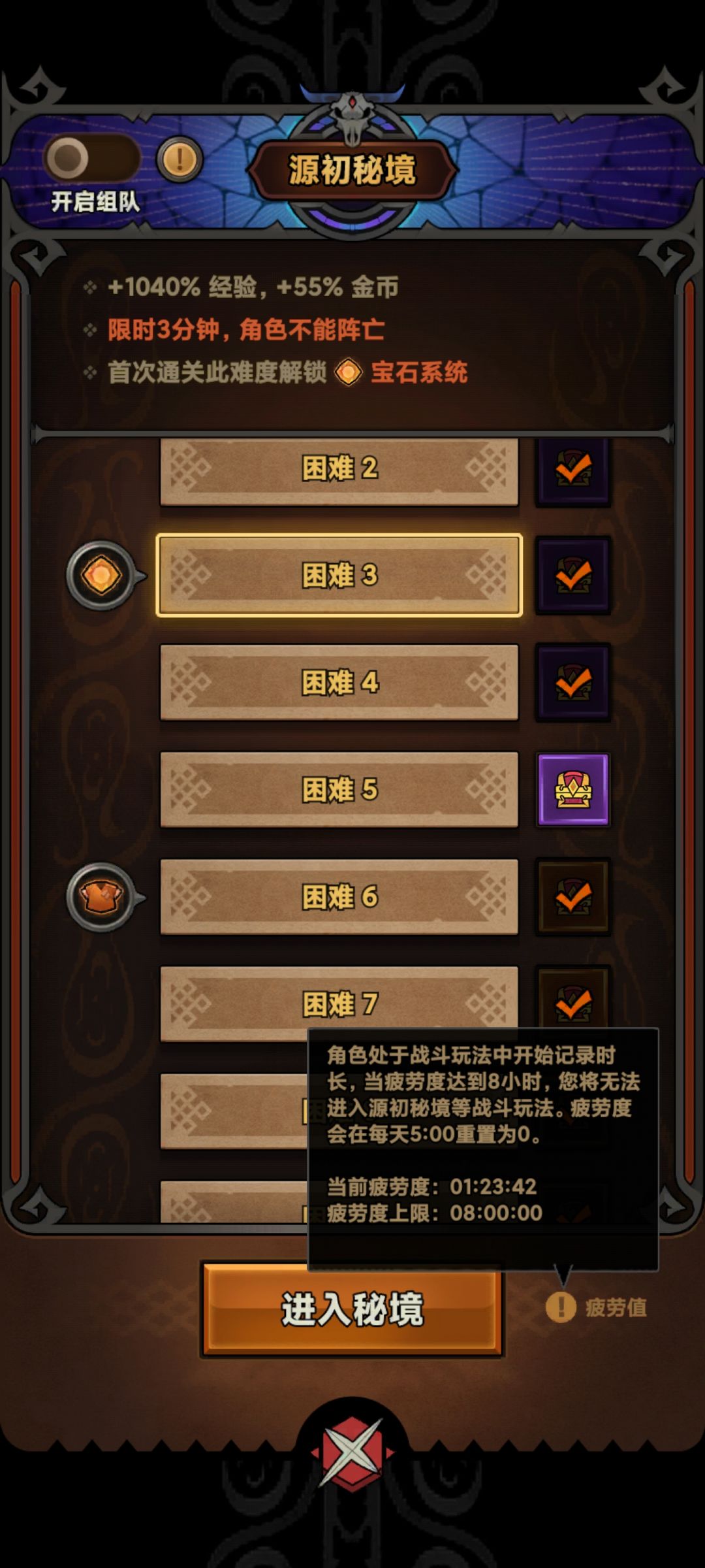 2、任务选择:第一次三个任务必须刷出20秘境和15秘境这两个,剩余4个可选100W金币、恶灵法师、血腥狼王和囚鸦行者这样副本刷20次困难副本就可以完成任务了,这三个BOSS在困难必出。