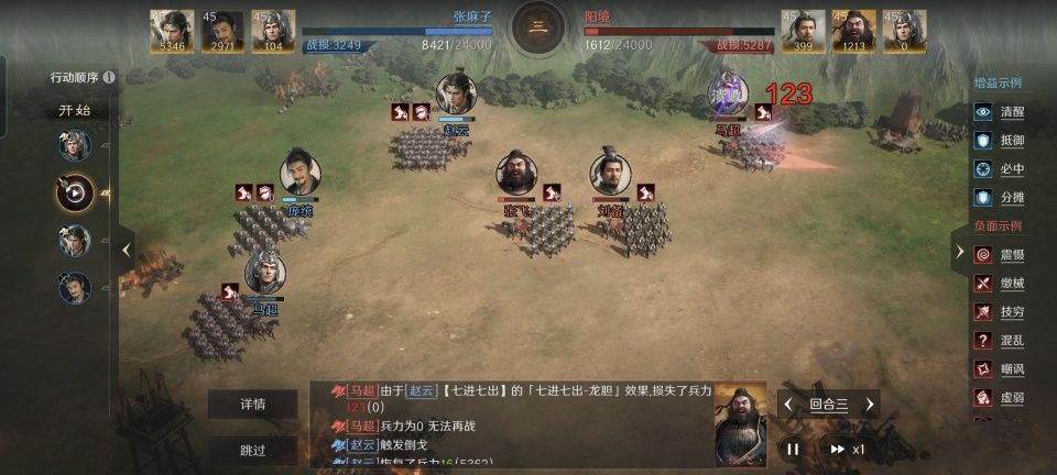 赵云战法:七进七出+风卷残云+锐不可当。韬略库:金鼓善本+神勇(专属)+胜敏善本。轻骑兵特性疾驰,专精点亮游刃有余。凭借着鱼鳞阵前排的站位加持,结合赵云自身的战法、兵书增益,他总共获得了75%的规避率提升。尤其是在战斗开始的前三回合,丝滑程度最为理想。
