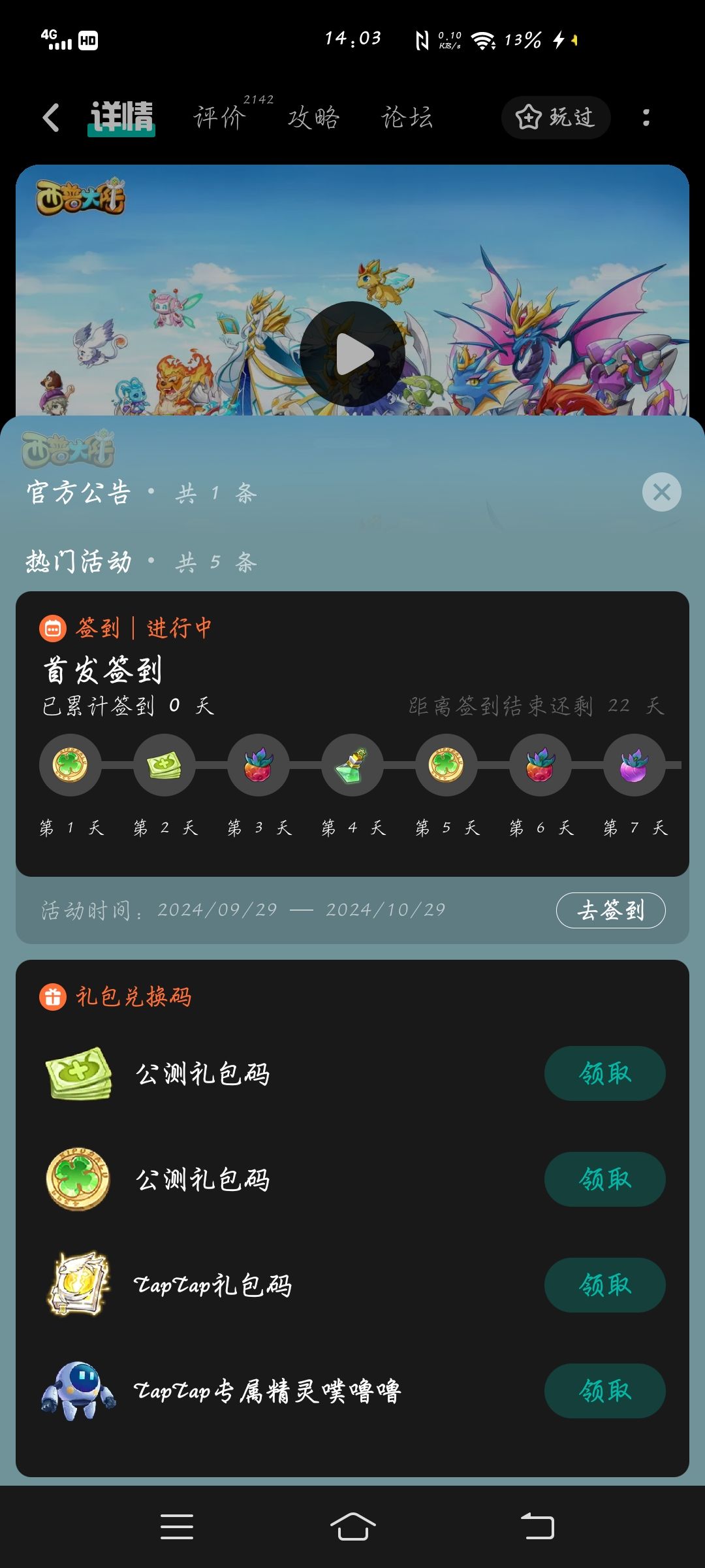 除了四个兑换码,还有每日签到活动,记得每天签到领取哦!