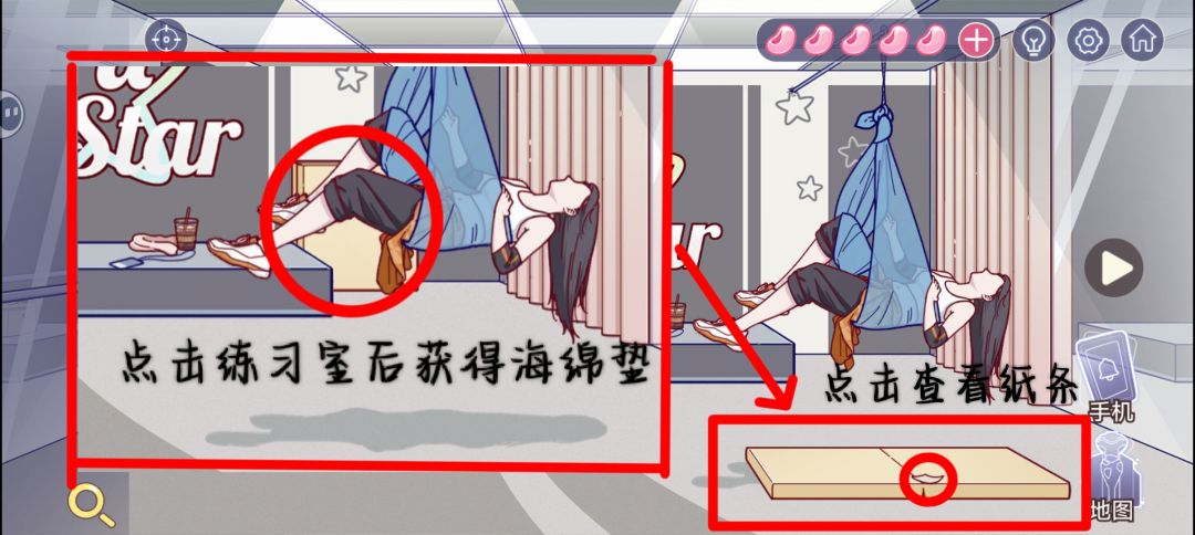 1.进入练习室,点击获得【海绵垫】,将【海绵垫】垫在安婕下方,点击获得垫子上的【纸条】
