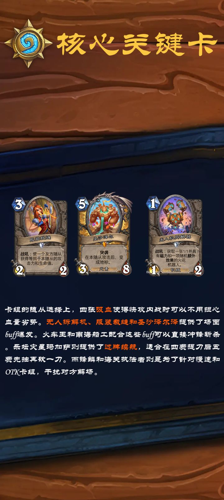 卡组的随从选择上,四张吸血使得快攻内战时可以不用担心血量劣势。无人拆解机、服装裁缝和圣沙泽尔泽提供了场面buff爆发。火车王和南海船工配合这些buff可以直接冲锋斩杀。乐坛灾星玛加萨则提供了过牌续航,适合在四费提刀后五费先抽再砍一刀。而锋鳞和海关执法者则是为了针对慢速和OTK卡组,干扰对方解场。