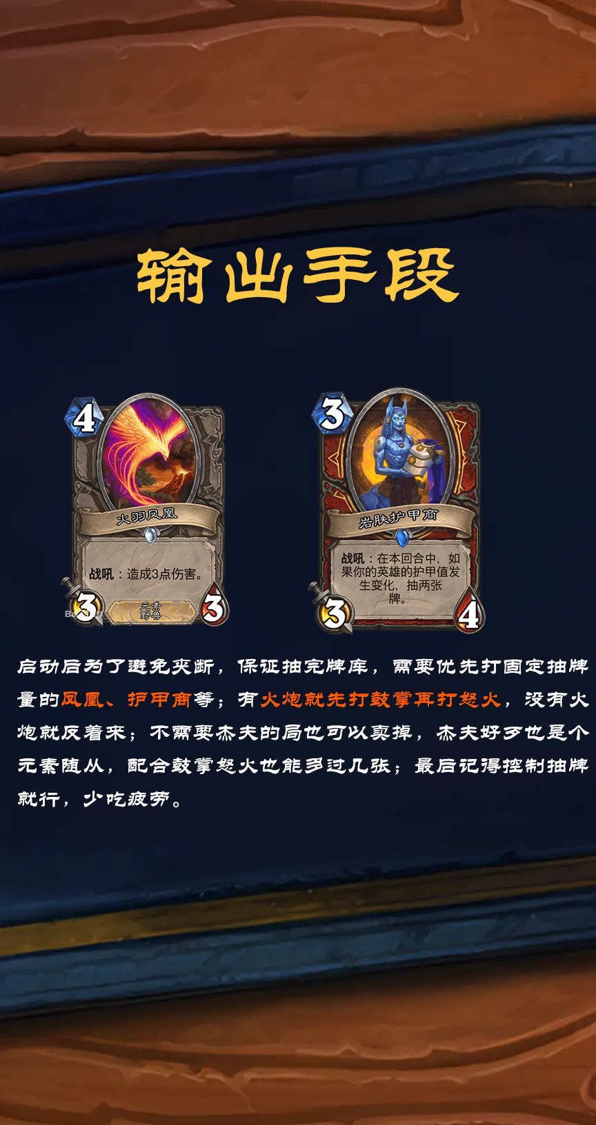 启动后为了避免夹断,保证抽完牌库,需要优先打固定抽牌量的凤凰、护甲商等;有火炮就先打鼓掌再打怒火,没有火炮就反着来;不需要杰夫的局也可以卖掉,杰夫好歹也是个元素随从,配合鼓掌怒火也能多过几张;最后记得控制抽牌就行,少吃疲劳。#炉石传说 #炉石传说攻略