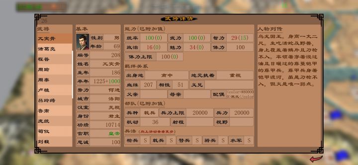 然后就是招女的结婚兀突骨增加兀突骨的统和武,兀突骨确实强,战斗中没有人能打他超过500兵,基本都是打100来兵,最高记录一人接受3个城市的攻击被我击退。