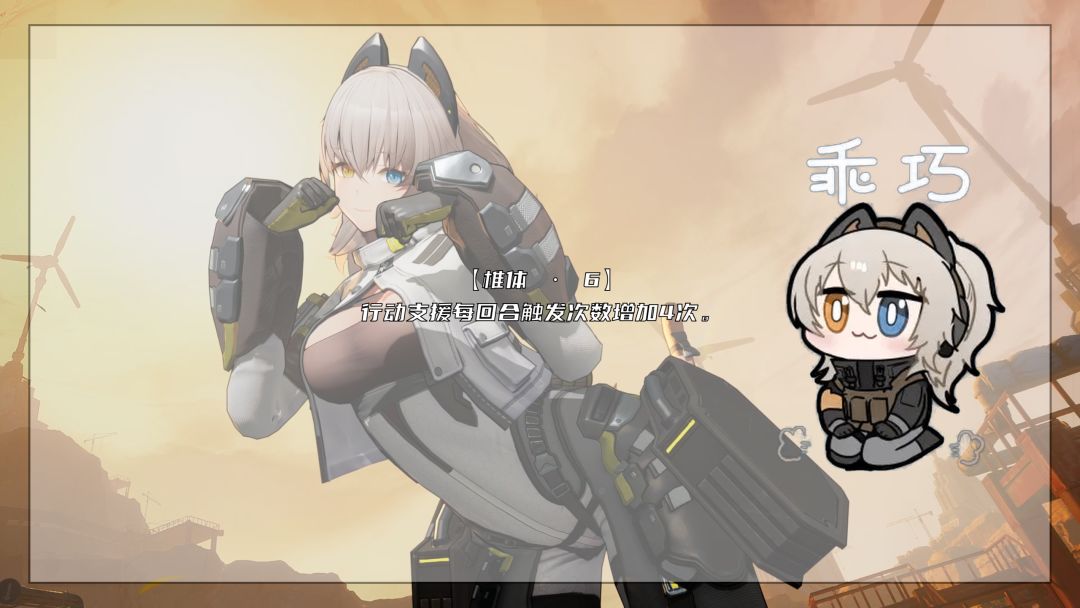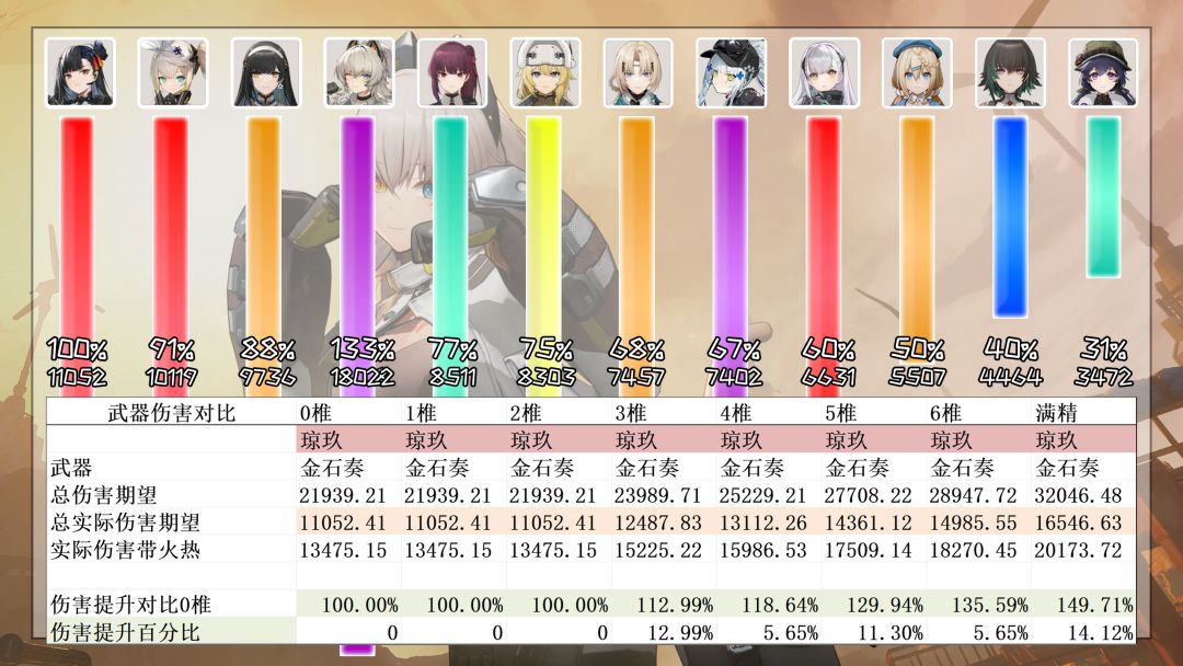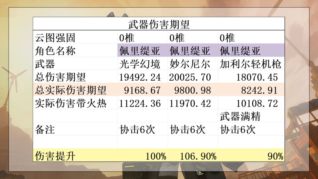 最后就是云图强固了,佩里缇亚的椎体1到5几乎可以说是提升为0。那我们就单独讲讲6椎:行动支援的次数从6次提升到10次,打满等于每回合多了200%的倍率以及额外16点稳态伤害。此时,搭配0椎G11的精炼一专武佩里缇亚的伤害会达到2玖,满精琼玖不吃拐的伤害也只有1.5玖,即便是吃了拐伤害也很难达到2玖。至少是在目前的时间点,满椎佩里缇亚是输出最高的常驻角色,要问为什么?每回合600%的倍率不是跟你开玩笑的(可露凯:在想我的事?)。