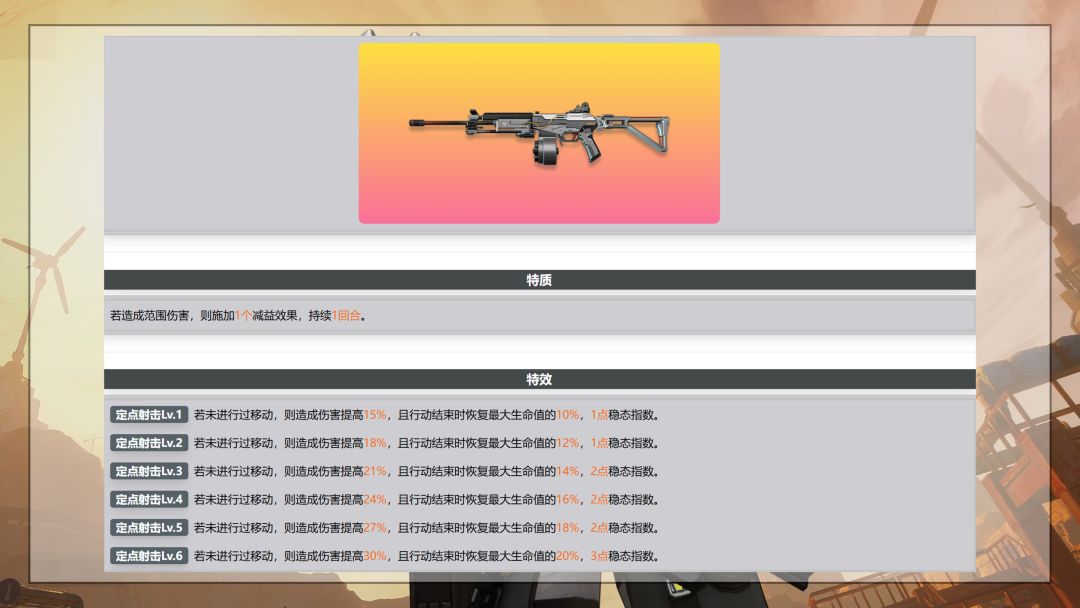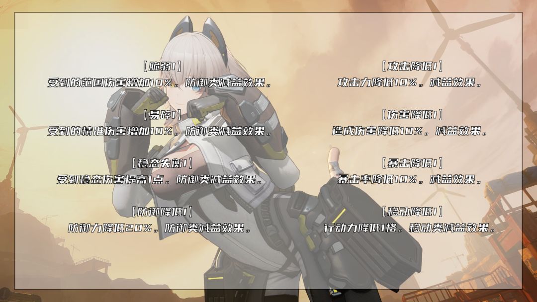 有关机枪特质的【若造成范围伤害,则施加1个减益效果,持续1回合】,该效果的覆盖率极高,0椎大猫猫的攻击可以在单回合最多施加7个减益效果,但是由于已经被施加的效果会被重复施加,而且不会相互叠加,所以实际上敌人被施加的减益效果会少于7个。那么问题来了,随机减益效果有哪些呢?