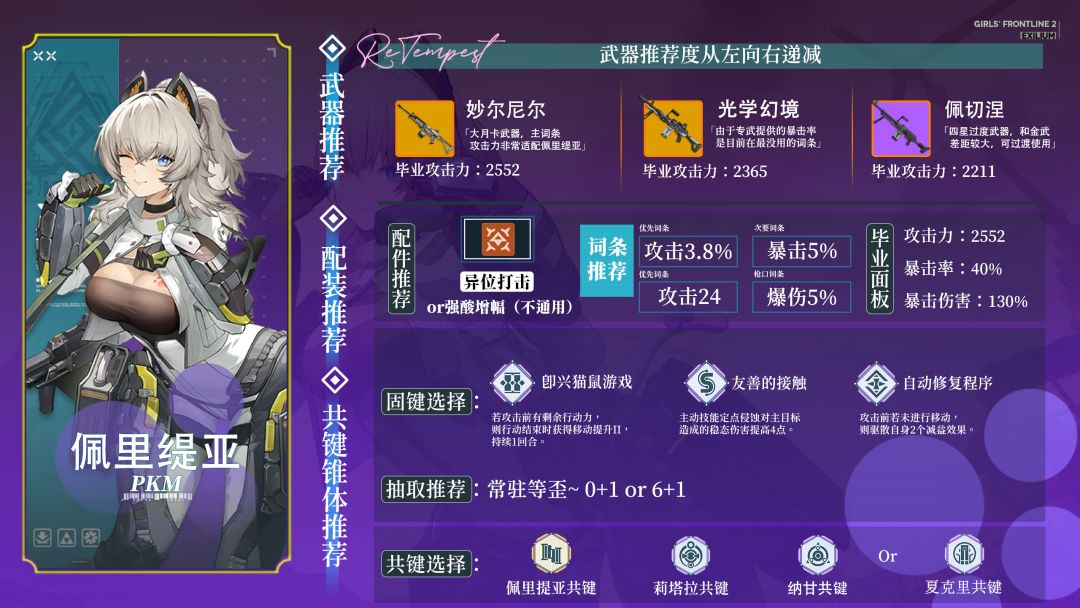 有关武器选择:配件我还是推荐异位打击,就是因为他泛用而且只低5%的增伤,追求极致可以选强酸增幅。光学幻境的站桩伤害会略低于妙尔尼尔,原因还是武器的暴击率副词条过于拉胯。如果进行过移动妙尔尼尔会无法触发增伤