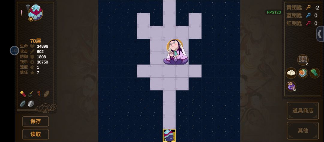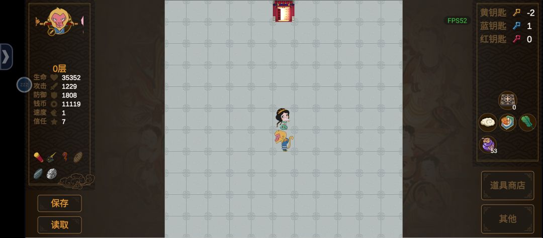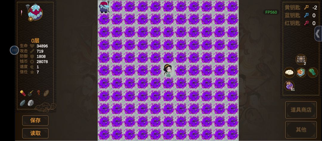 终于通关了,三个结局都打了,钥匙是感觉严重不足,所以在用之前考虑门后面值不值得开,先以爬楼为主,最后有多余的钥匙再开剩下的门。留意有很多暗门,对应坐标大神已经发出来了,对游戏通关有很大帮助。1~8层的东西几乎要捡完才能打赢8层商店门口的老虎,还要考虑捡东西和开门的先后顺序,所以个人感觉8层前比后面还有挑战性一点。8层后就是无脑堆防了,20层前把攻升140+不然石狮子过不去,其他根据地图怪的攻击升防,在找到沙和尚之前不要过多的升攻防,沙和尚有优惠属性。血瓶也是尽可能的少捡,后面有个门神当你处于两个门神之间你就会按30%比例扣血,血量越多扣的越多。收徒弟的时候怎么仁慈怎么来,会加属性的。地图BOSS不留活口,该收的收不要客气,不会影响剧情。最后在56层有个卖钥匙的,你可以一直卖钥匙获得金币,前提是你需要开的门已经开完,不然钥匙的差价会把你直接劝退!奉劝大家多多存档!!!祝大家游戏快乐人人通关!