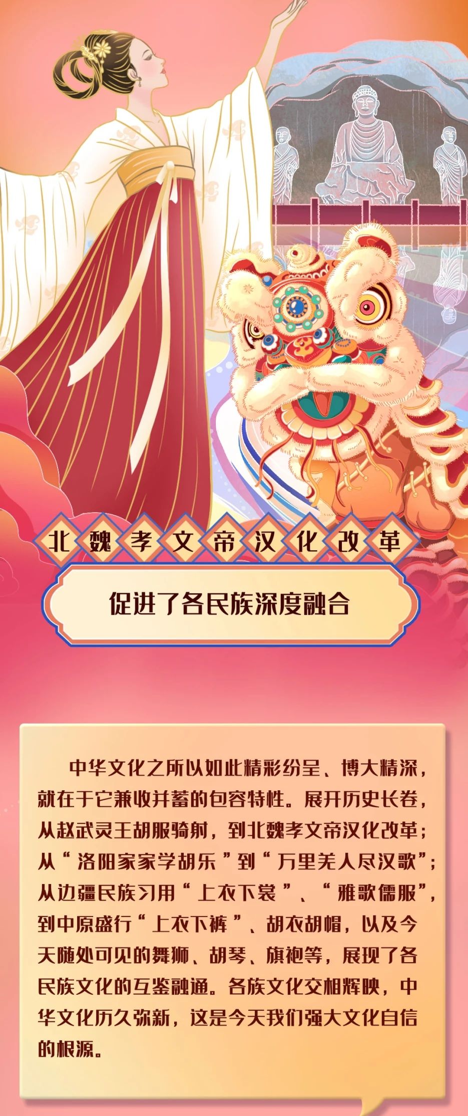 中华文化之所以如此精彩纷呈、博大精深,就在于它兼收并蓄的包容特性。展开历史长卷,从赵武灵王胡服骑射,到北魏孝文帝汉化改革;从“洛阳家家学胡乐”到“万里羌人尽汉歌”;从边疆民族习用“上衣下裳”、“雅歌儒服”,到中原盛行“上衣下裤”、胡衣胡帽,以及今天随处可见的舞狮、胡琴、旗袍等,展现了各民族文化的互鉴融通。各族文化交相辉映,中华文化历久弥新,这是今天我们强大文化自信的根源——2019年全国民族团结进步表彰大会