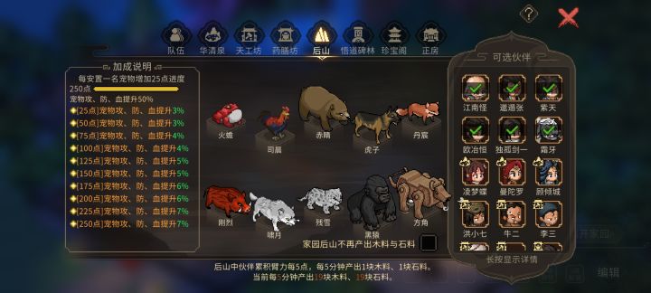 驯兽的话不断把队里面的宠物换着来喂,而且物资等级越高得到经验越多,这游戏里面的宠物还是挺多的,我现在到手的有12个(图里以外的还有个熊猫和老虎,据说释法寺里还有个白猿),一下子就能提升12x10x25(蓝色喂得物品25经验,紫色75,绿色5),合计3000经验。