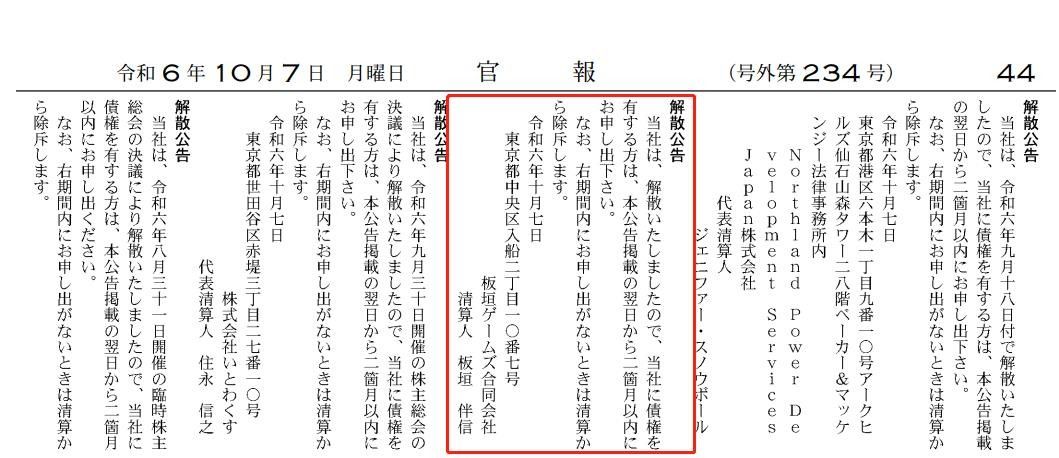 10月7日,根据日本政府公报发布的公司解散通知,由特库摩游戏制作人板垣伴信创建的板垣游戏工作室现已被解散,该通知内容为:“解散通知:板垣游戏工作室已解散,因此,如果您对我公司有任何索赔,请在本通知发布之日起两个月内提出索赔。”
