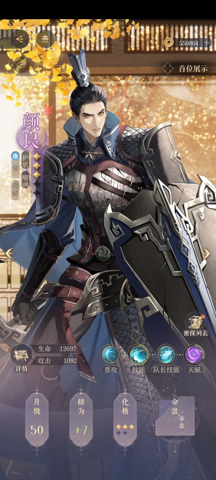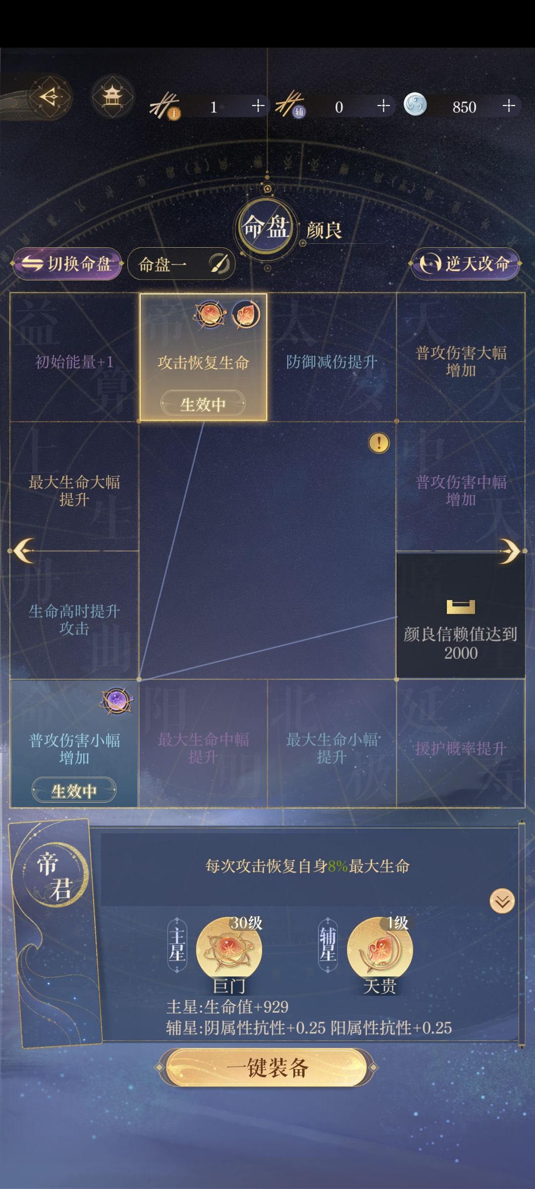 对于我来说,这个队伍的核心是颜良,命盘必须洗到一个攻击回血,其他随意,血量尽量堆到12000以上,我这里是升级了星石堆上去的(星石不一定非要橙色的,紫色的也行,但是蓝色的不建议升级)。