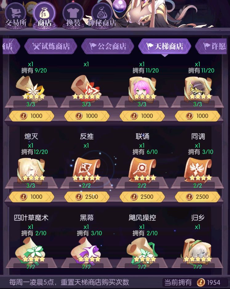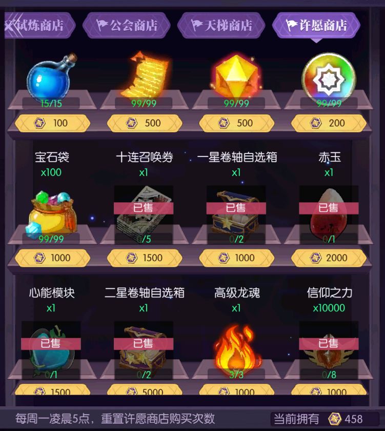 ●许愿商店每周一刷新,r4期间许愿商店只买一星卷轴自选即可,需要2000许愿币(8w公会币),单次公会boss刷取5700公会币才能保证收支平衡,所以推荐r4毕业后再刷注:卷轴400级或者离r5只有1个月时便无需购买,积攒许愿币等r5许愿商店。