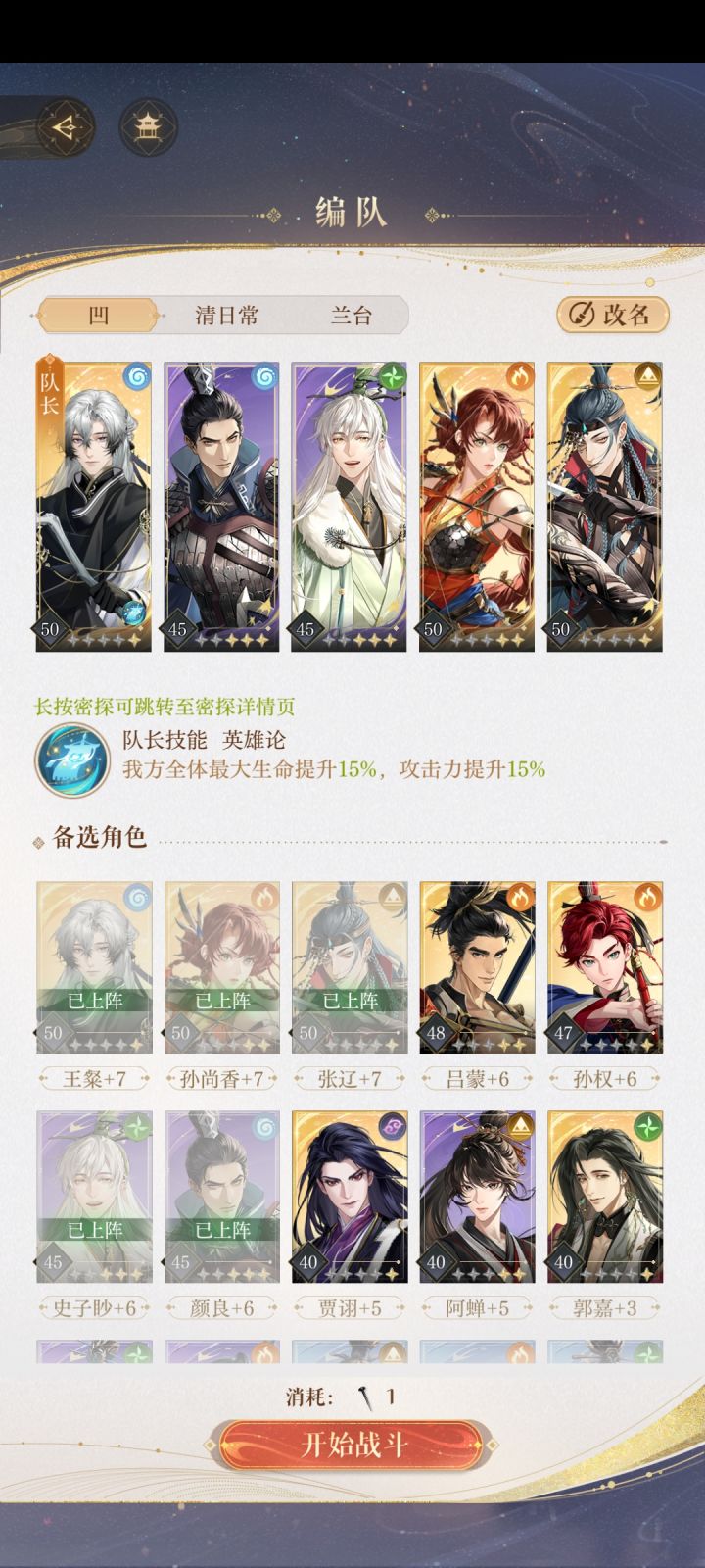 王粲+颜良+狮子喵+两单体c(如果有张辽,且搞了无路可退这个命盘,最好按照我的排序,可以减少他下拉防御断连击的可能性)。