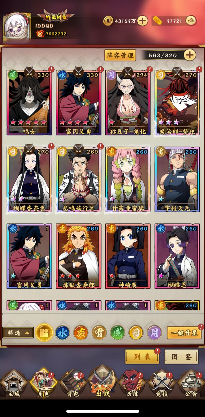 愈史郎以其高额的治疗量成为队伍的核心,确保队友的生存能力。祢豆子提供小范围控制及自我回血,炭治郎则以其独特的“一血无敌”技能和自身回血能力,作为坚韧的前排输出与坦克。此阵容适合初期资源有限,注重生存与持续作战的玩家。