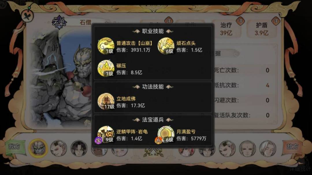 石僧主动技能"顽石点头",造成防御力倍率的伤害并获得法宝蓄力,且当处于【山岳】状态,无论普通攻击还是主动技能都可额外施展碾压.