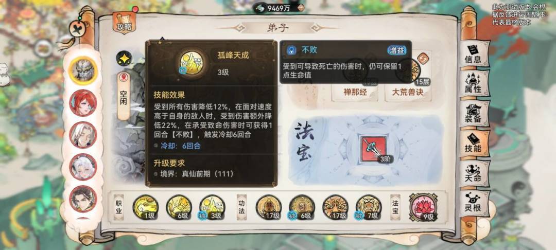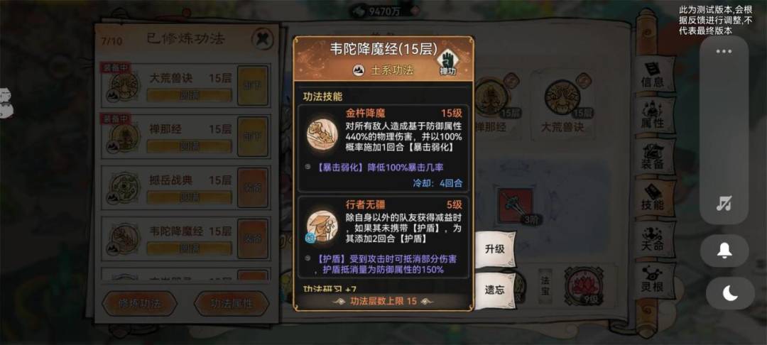 4. 功法选择:前排肉坦流功法石僧可以选择的功法,如下:大荒+玄岩(研习20)