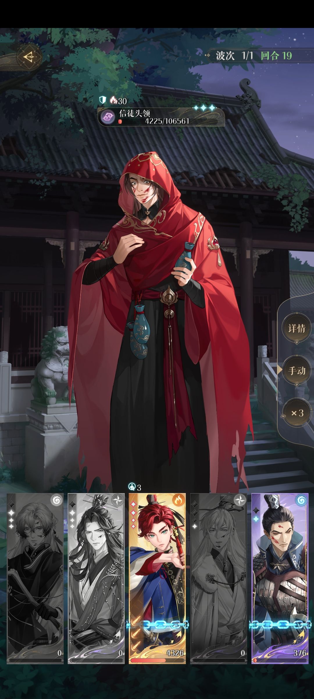 ②只要是boss开大回合,渺良就要同步开大,粲登权下拉防御,其他时候全员普攻足以(粲登大招只要不是boss开大回合有就用)