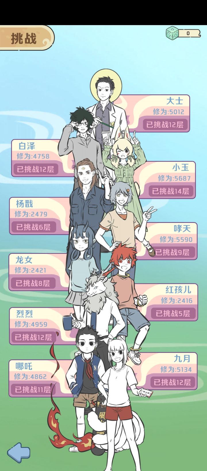 如图所示,哮天战力最高但却爬不到十层以上。剧情里是接飞盘准到可以开班的神犬一只,战斗里是回回脱嘴的二哈一枚(无恶意)