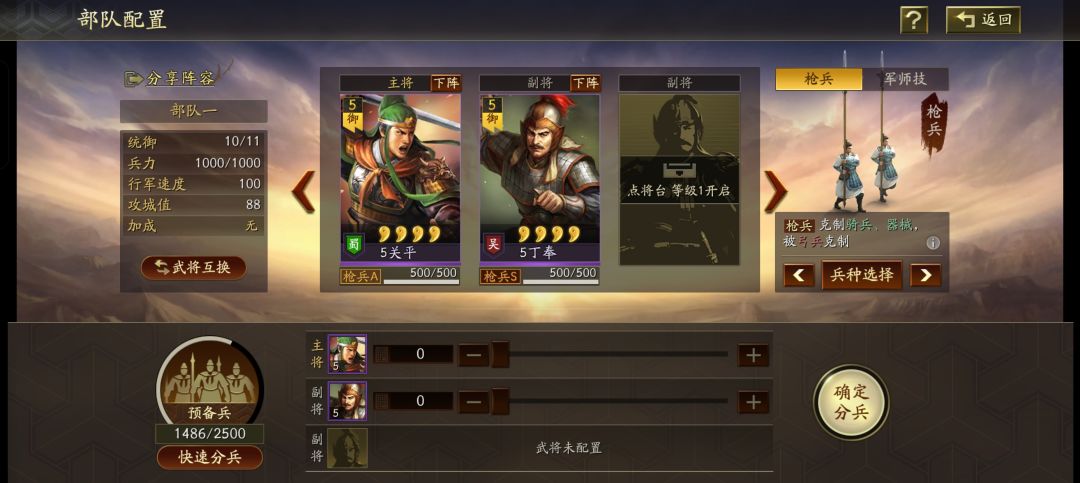 每支军队都是由一个主将和一到两个副将组成,前期武将搭配方面主要以高星级为主,其次再考虑兵种。