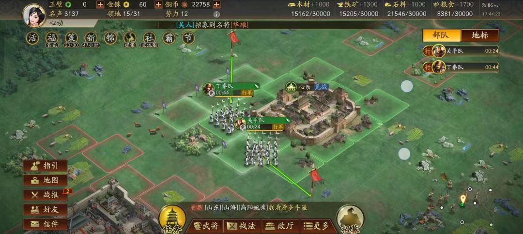 然后重复以上过程,在关平和孙乾体力消耗完之前大概能打下3-4块3级资源点,此时系统会赠送第二名紫将晓城卫,重复以上操作,最后基本可以全部占领周边的所有2、3级资源点。