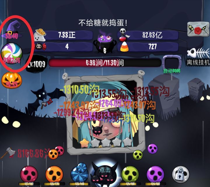 总结一下,左上角金币、攻击、南瓜必点,不能断,南瓜福袋必点,宝箱直接开。糖浆够了就转生。就这么简单