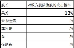 从表格可以看出,她在所列举的舰长中,对敌方舰队旗舰的攻击概率最高,达到了13%!而其他舰长对敌方舰队中旗舰的攻击概率基本都在3%以下。