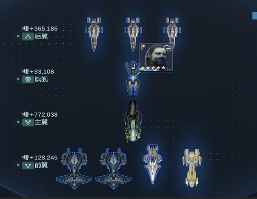 吴秀后翼阵位有攻击和抗性加成,所以这排的舰船可以装高攻击,高命中武器,搭配抗性部件作为输出船。