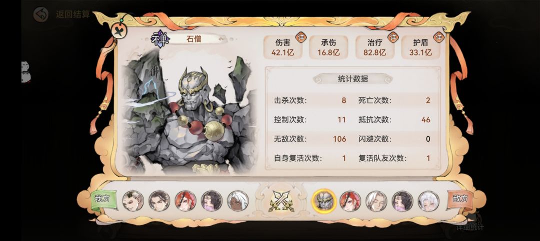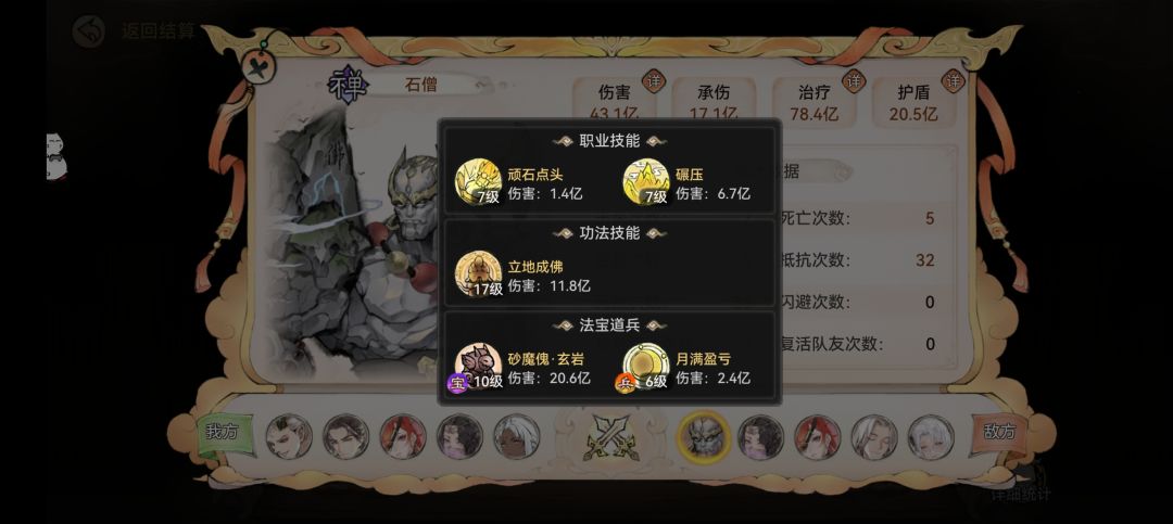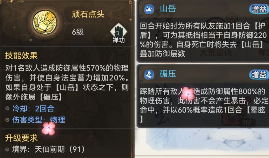 技能:石僧的主动技能顽石点头,造成防御力倍率的伤害并获得法宝蓄力,且当处于山岳状态时,无论普通攻击还是主动技能都可额外施展碾压。被动技能使其受到伤害减免,且处于尾速时,进一步提升减免百分比 。