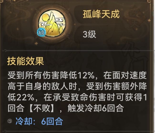 被动技能孤峰天成,是减伤和不败,类似普通禅的固定被动技能,增加生存能力。