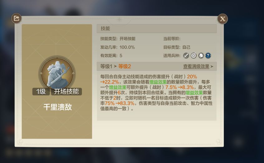 前三回合减伤,与迁延战术冲突;受伤时有概率提高敌方所受伤害,最多叠加五次;从第四回合起,拥有10%的吸血,吸血的恢复提供给伤兵最多的友军。