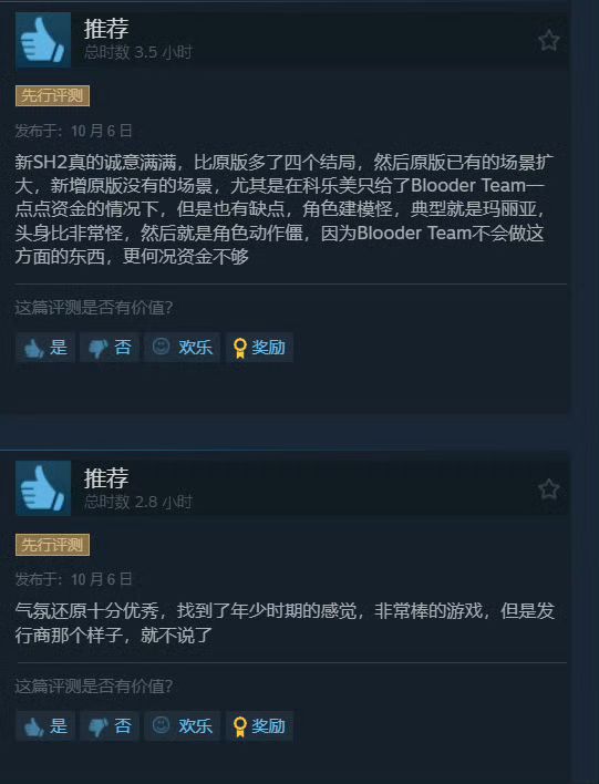 备受期待的《寂静岭2重制版》豪华版已经解锁,普通版也将于10月8日中午12点与玩家见面。游戏在Steam平台上获得了极高的评价,587篇评测中,好评率高达94%。
