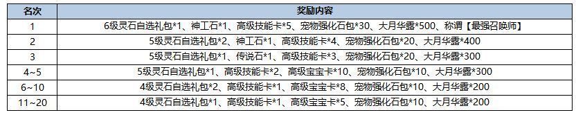 活动描述:活动结算时,召唤兽战力最高的20名玩家可以获取丰厚奖励哦~
