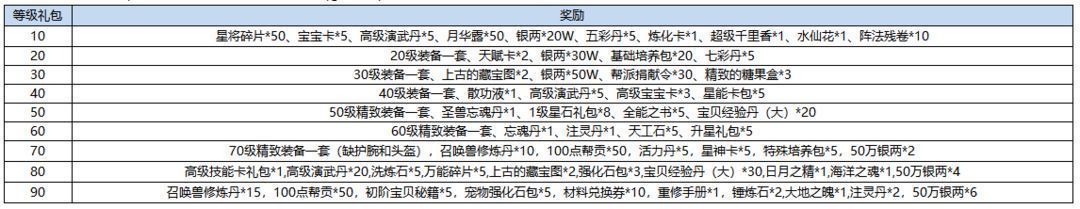 活动内容:新服期间,水粉们每升十级即可领取等级大礼包一份,福利多多助你成长。