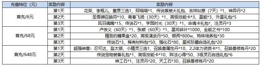 活动内容:水粉们首次充值任意金额即可领取价值丰厚的首充礼包。