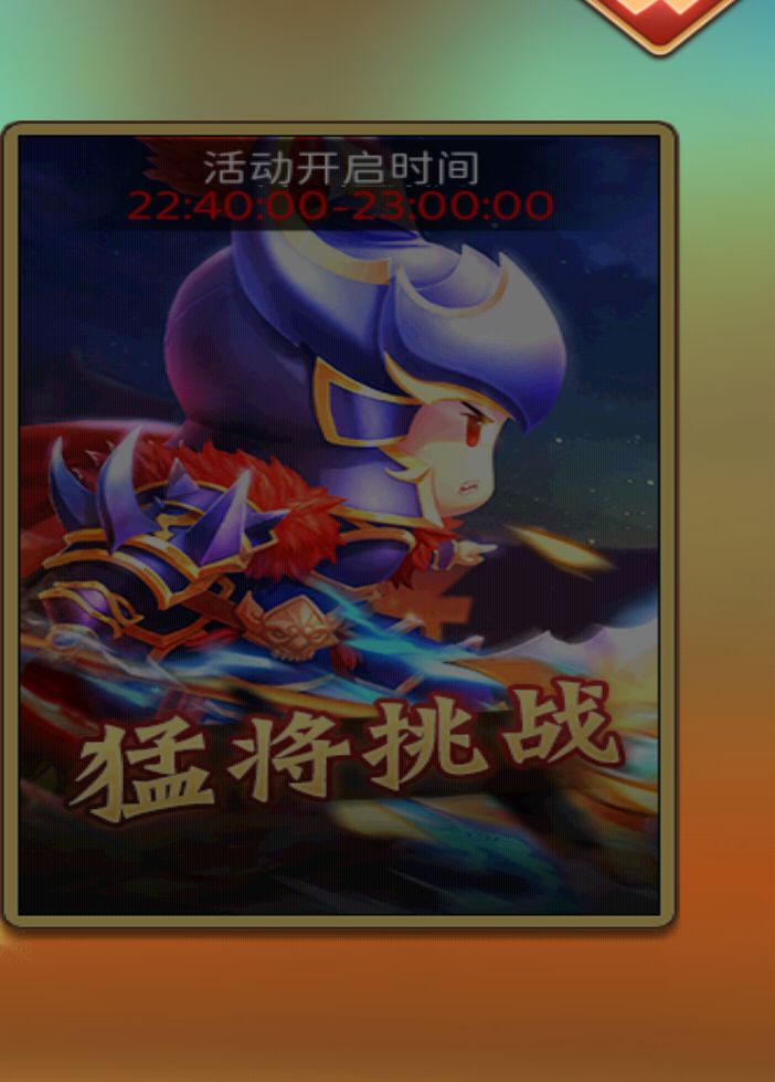 1猛将挑战每天开启三次,每次活动持续20分钟,猛将死亡后会立即刷新下个猛将。每次活动最多有十个猛将,如果所有猛将都被击败下次活动会刷新新的猛将。