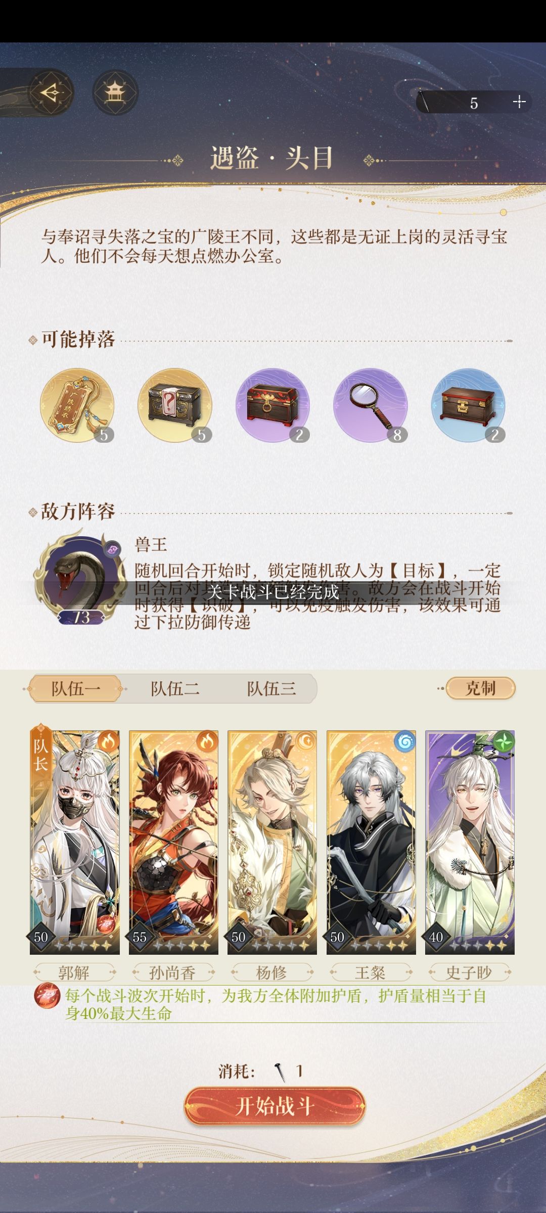 先说山贼首领打法,站位配对1号位杨修,2号必带火系,3号位输出,4号位必带土系,5号奶爸