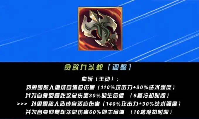 另外,附魔装备:贪欲九头蛇迎来更新,主动技能伤害和生命值回复皆有提升,这让李青等需要在技能中穿插普攻的英雄有了提升,打野召唤师们可以尝试上手了。