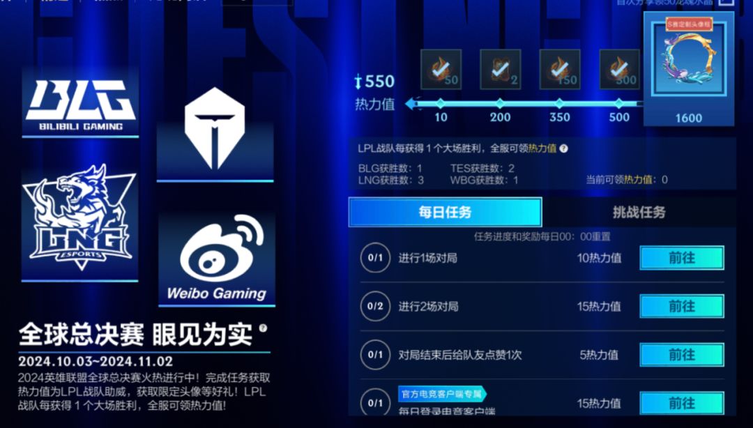 2024英雄联盟全球总决赛火热进行中!截止至11月2日,召唤师完成任务获取热力值为LPL战队助威,即可领取全球总决赛电竞个性化道具自选宝箱、S赛定制头像框-勇往直前 百炼成金和龙魂水晶等好礼。同时,LPL每获得1个大场胜利,全服可领热力值!