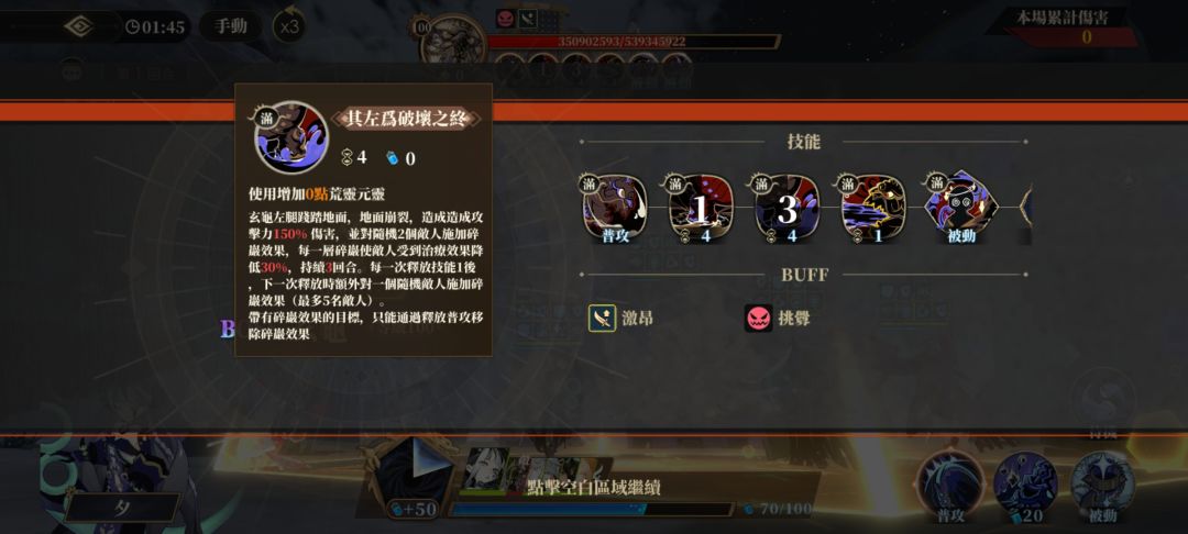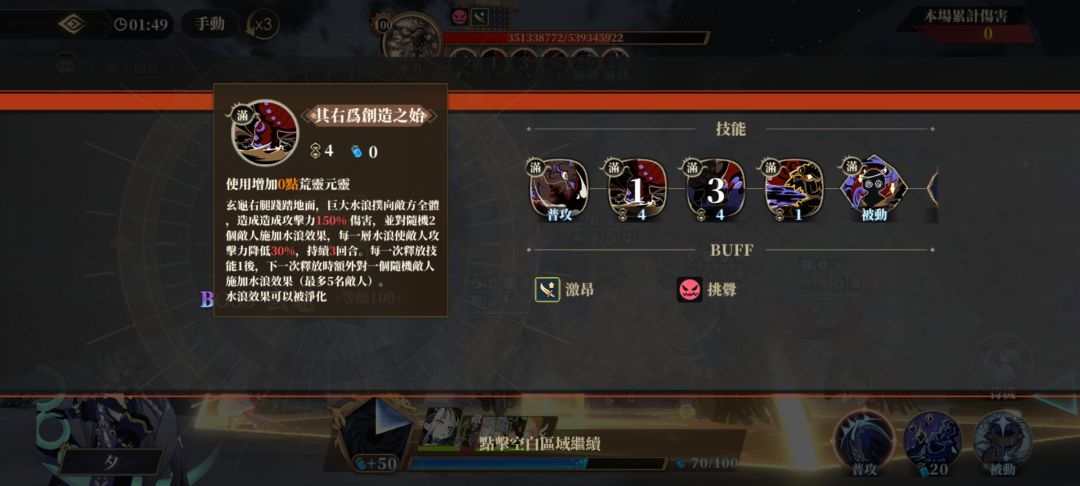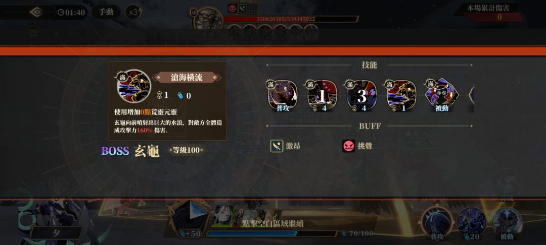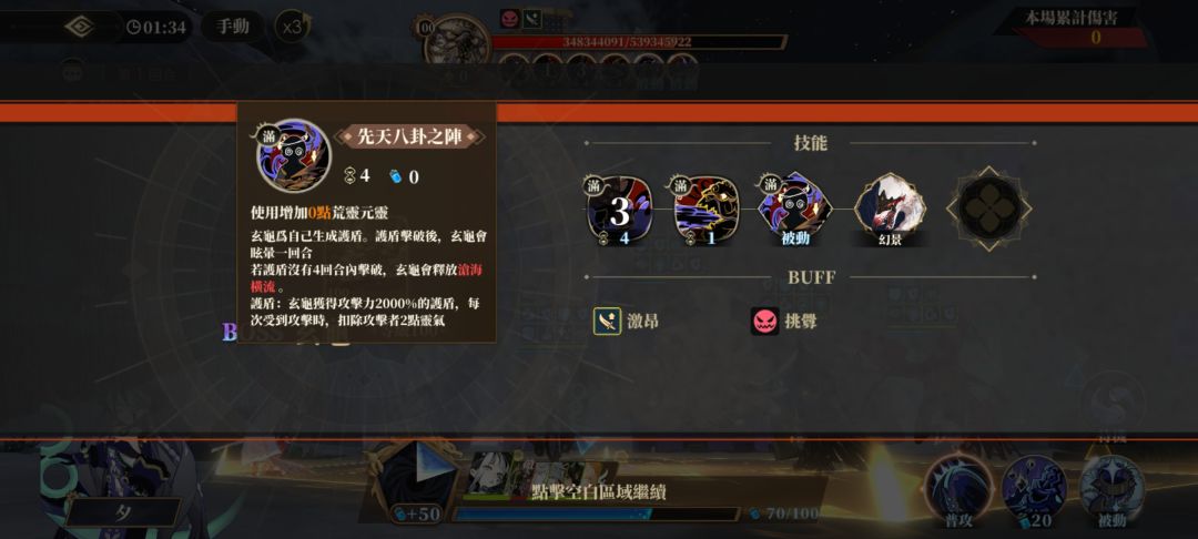北荒玄君会在第一回合有一次群体随机攻击,伤害爆炸,在上大禹的情况下也有可能直接被击杀,随后boss会生成一个护盾,护盾击破后会眩晕,尽量在这个过程中对boss造成更多伤害。后续阶段,boss的攻击均为高伤害群体攻击,同时伴随着不同的负面效果,根据负面效果的不同描述需要及时使用净化技能和普通攻击来移除减益状态。