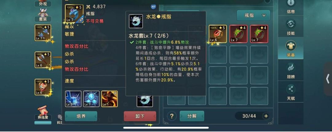 装备附魔水龙套就是强化所有职业的天赋主动技能,随机从旅人,冒险和水龙之间随机获取一个附魔属性,类似进阶但是只有水龙有价值。并且附魔会附加五维属性12-30随机,可以洗练,7级装备预估保守能用三个月左右,投入不大的号还是优先专精,毕竟这个装备只能提升主角,专精是全体提升,而且不会过时。