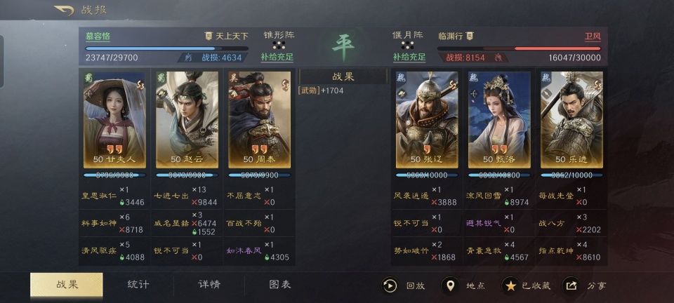 周泰能扛,甘夫人能奶,赵云能滑又能砍,对面的先登无双确实有些招架不住。尽管吕布的表现同样不俗,然而乐进和陈宫却没有他那般顽强,此战的胜负结果也是情理之中。