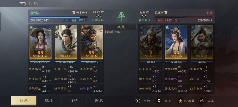 在此特别鸣谢游戏ID名为“慕容恪”的玩家朋友,给本文提供了宝贵的创作素材。慕容恪用自己的实际行动告诉了我们,以丝滑著称的赵云同样也可以硬刚,除了他自身的战法配置,关键也有队友的成分。这甘夫人和周泰加入进来组成的锥形阵,就活生生把对面乐进、吕布和陈宫组成的先登无双骑给打垮了。具体的原理是如何筹谋的,且看下文分解!