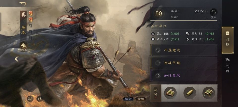 周泰战法:不屈意志+百战不殆+如沐春风。韬略库:治兵手抄+谋战残章+兵情手抄。重骑兵特性坚韧,专精点亮陷阵摧锋。相比起赵云而言,周泰的生存能力也是有过之而无不及。除了帮助抵挡伤害,周泰还利用百战不殆精准叠加了他自己的统率,赵云的武力和甘夫人的智力,这攻防体系真的如同铁三角那样稳定。