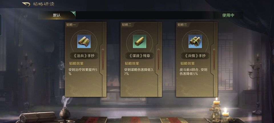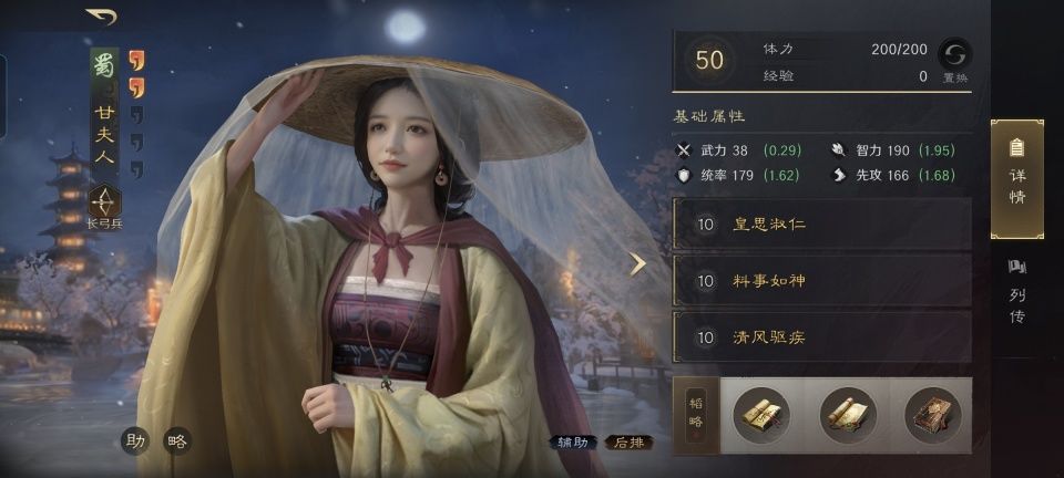 甘夫人战法:皇思淑仁+料事如神+清风驱疾。韬略库:临峰善本+先勇善本+汉女传(专属)。长弓兵特性洞悉,专精点亮袍泽同心。