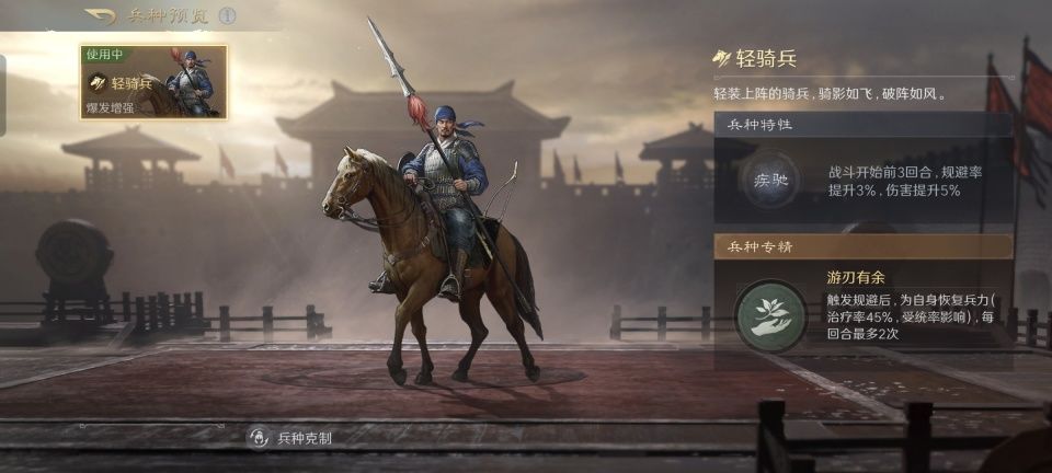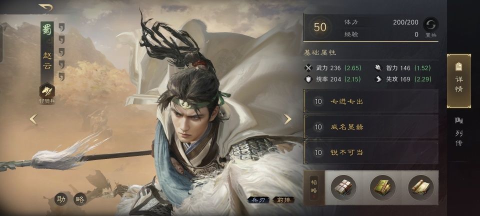 赵云战法:七进七出+威名显赫+锐不可当。韬略库:金鼓善本+神勇(专属)+胜敏善本。轻骑兵特性疾驰,专精点亮游刃有余。锥形阵前排16%的伤害加成,赵云肯定是吃完了。再算上锐不可当和兵种加持,总的伤害量提升了56%,还伴有16%的破甲,35%的倒戈和53%的规避。这就如同亚马逊雨林里的食人鲳,牙齿锋利下口见血,你想打他还被丝滑躲过。