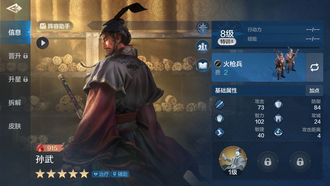 专属技能【兵家至圣】满级效果:我军全体累计造成5次伤害时,使我军随机1名英雄对敌军随机1名英雄造成1次伤害(伤害率80%,伤害类型由造成伤害英雄的攻击、智力属性较高者决定);我军全体累计受到5次伤害时,立即为我军伤兵最多的单位恢复一定兵力(恢复率80%,受智力属性影响),且使其下1次受到的的伤害降低(战时)20%(受智力属性影响)。